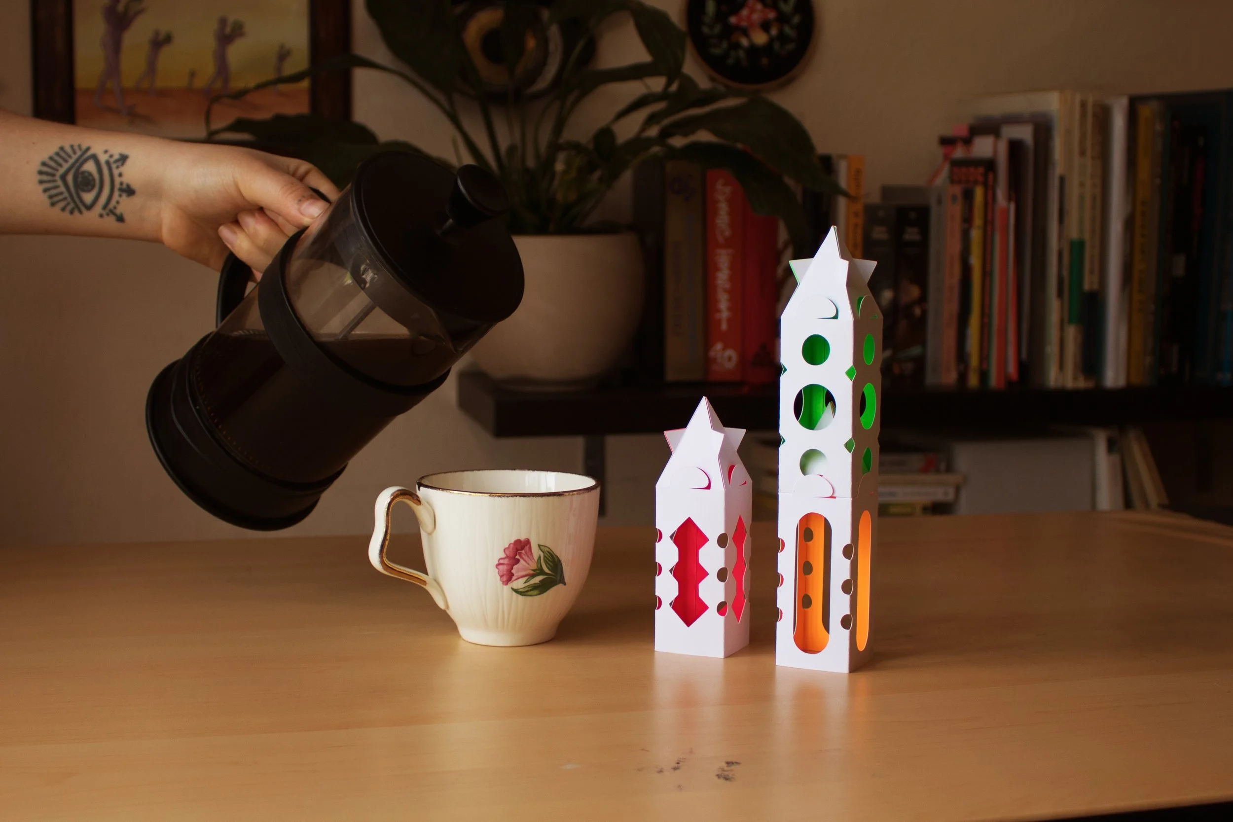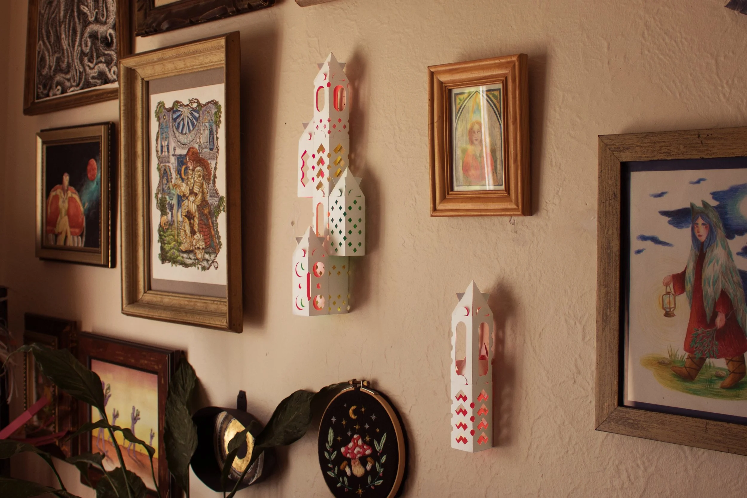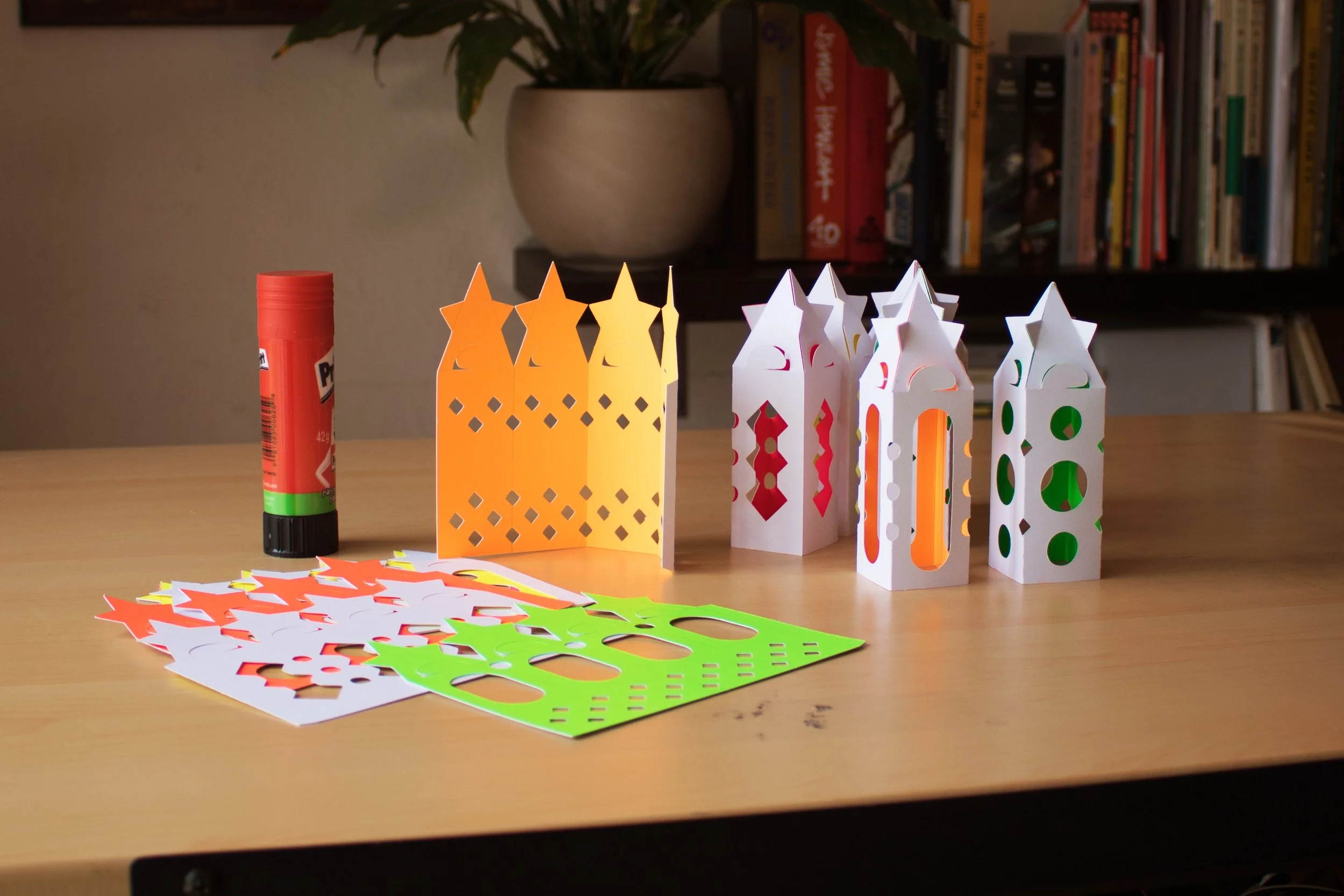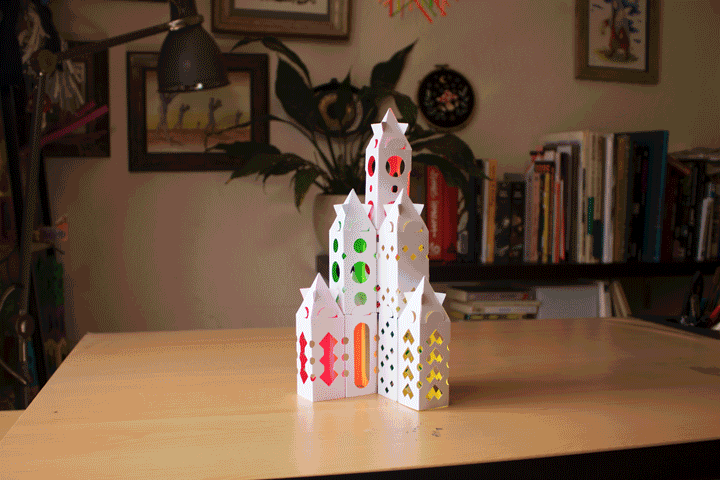 MUR-MUR, ce sont des maisons décoratives en papier blanc à l’extérieur et fluo à l’intérieur, découpées et prépliées à assembler soi-même, le tout livré à plat.